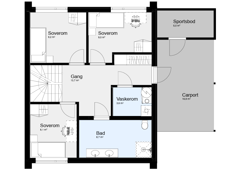 I første etasje finner du tre soverom, bad og vaskerom – praktisk plassert for en aktiv hverdag. Her er det også gode oppbevaringsmuligheter og en gjennomtenkt rominndeling.