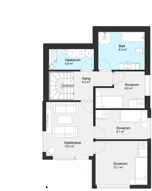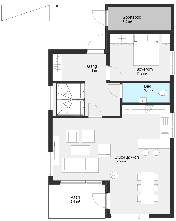 Den åpne stue- og kjøkkenløsningen i hovedetasjen gir en lys og luftig atmosfære, og fra stuen er det direkte utgang til en liten altan. Underetasjen rommer flere soverom, et stort bad, vaskerom og en ekstra stue.