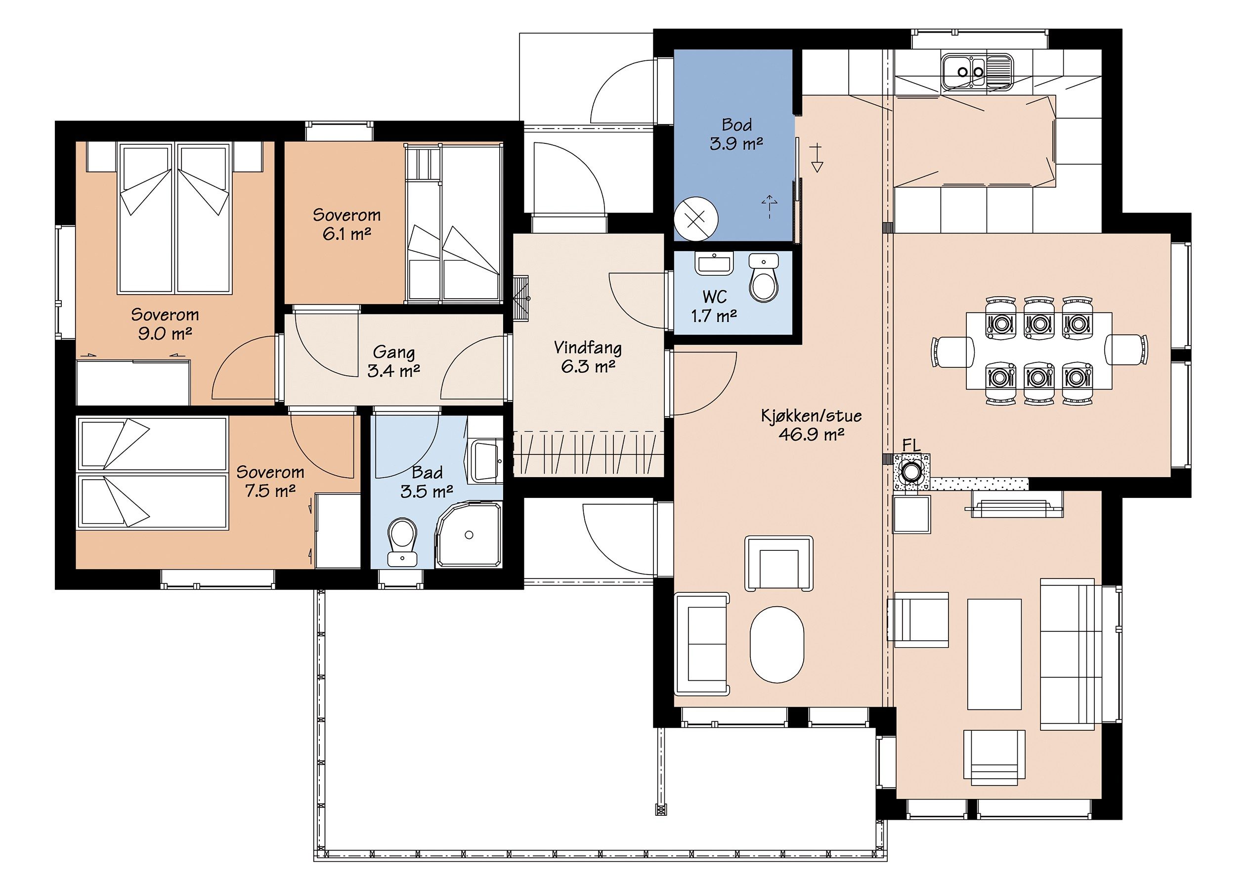 Inngangspartiet deler hytten i to avdelinger. Her er soveromsavdeling med tre soverom, hems og bad. I tillegg er det separat wc. Stue og kjøkken har åpen løsning med store vindusflater. Uteplassen er skjermet og har utgang fra stue.