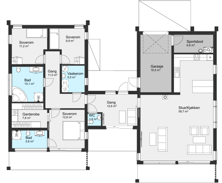 Med tre store soverom, to store bad, vaskerom, walk-in garderobe og et lite WC, er det god plass til hele familien – og litt til. Den integrerte garasjen og sportsboden gjør logistikken enkel, og alt er samlet på ett plan for maksimal tilgjengelighet.