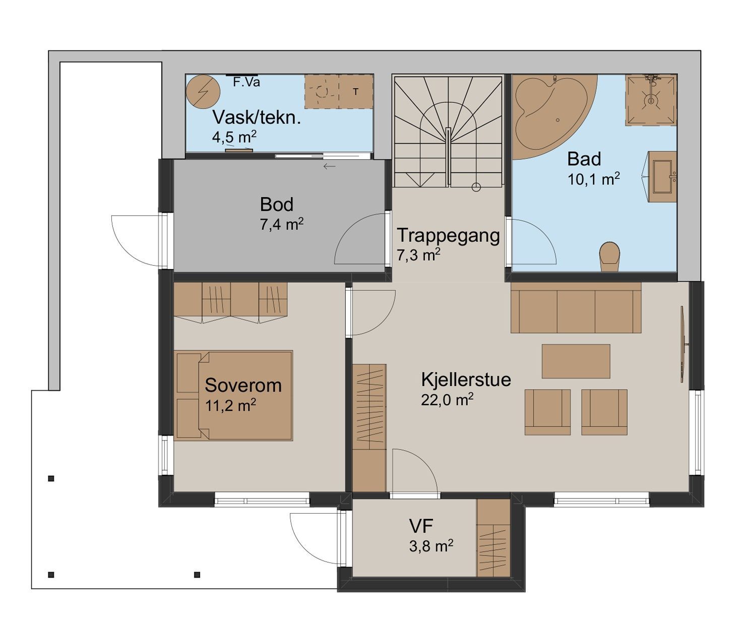 Vi kommer inn i hyttens underetasje via et overbygd inngangsparti under verandaen. Vel inne i vindfanget, som har oppbevaringsmuligheter for yttertøy, kan vi gå videre inn til en stor og lys kjellerstue. Her kan for eksempel de store barna få litt privatliv om kvelden, mens de voksne oppholder seg i stuen i andre etasje. Fra kjellerstuen har vi tilgang til et stort soverom, et romslig bad med plass til både dusj og badekar. I tillegg kan du gå opp trappen til andre etasje.