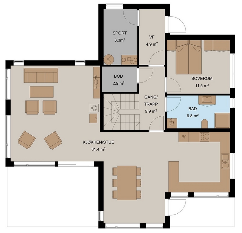 Boligens første etasje inneholder vindfang, bod, sportsbod, bad og husets største soverom. Her finner du også et fantastisk stue- og kjøkkenrom med åpen løsning. Kjøkkenet er stort, og kan gi plass til en lang kjøkkenbenk, eller kjøkkenøy om du ønsker det. Spiseplassen kan romme en stor spisegruppe og har tilgang til en skjermet, overbygd utekrok med plass til et par stoler og et cafébord. Stuen har åpen himling, og sammen med høye vinkelvinduer blir dette et trivelig og lyst oppholdsrom med plass til flere sittegrupper. Her har du også utgang til terrasse og hage gjennom en praktisk skyvedør i glass.
