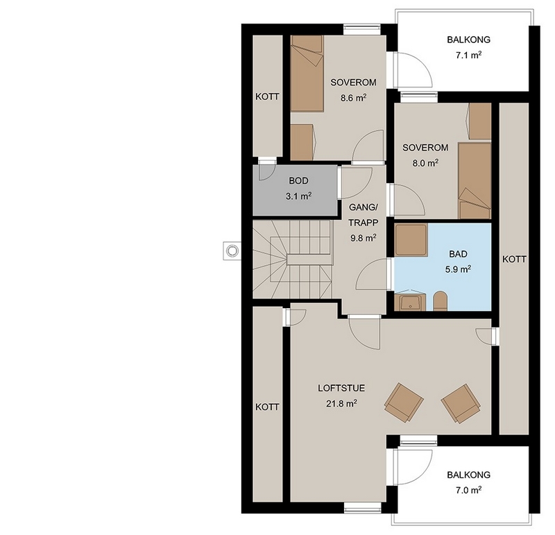 I loftsetasjen finner du to soverom, bad, bod og en loftstue. Overbygde balkonger i begge ender gir deg tilgang til koselige uterom fra ett av loftets soverom, og fra loftstue. For å utnytte plassen maksimalt har vi tegnet inn flere kott i andre etasje, som gir deg gode muligheter for oppbevaring.