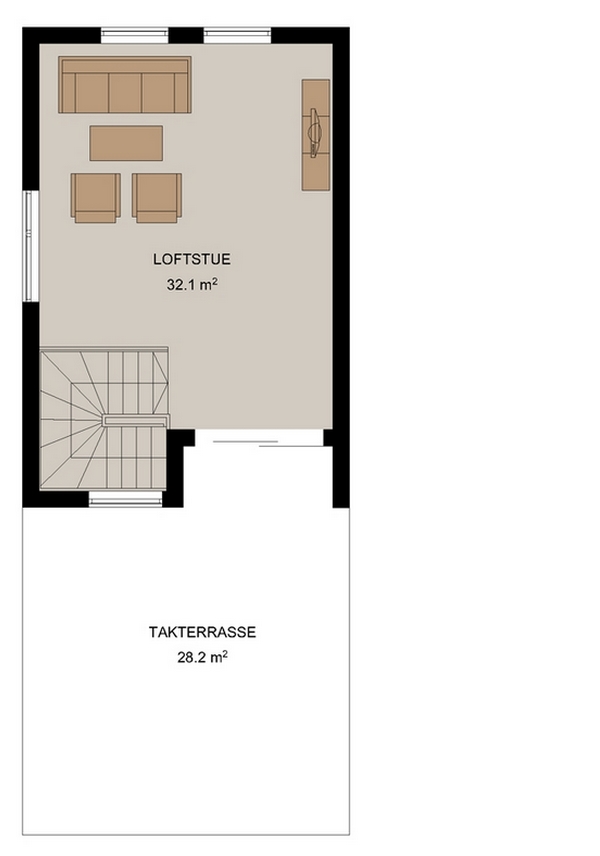 I øverste etasje finnes en romslig loftstue og en storslagen takterrasse på hele 30m2 hvor man kan nyte utsikten i tre himmelretninger og har solen hele dagen.
