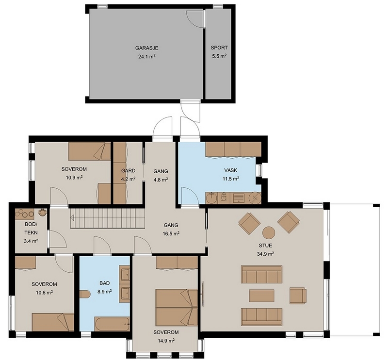 I første etasje gir et overbygd inngangsparti ly for vær og vind, og du har mulighet til å gå direkte inn i boligens vindfang eller inn til boligens vaskerom. I entréen finner du et praktisk garderoberom med skyvedørsåpning for god oppbevaring. Herfra har du også tilgang til tre store soverom, et innholdsrikt baderom med dobbel vask, bod/teknisk rom og en lys og flott kjellerstue med direktetilgang til terrasse og hage. En romslig garasje på 24,1m2 har også en egen dør som leder til overbygd inngangsparti.